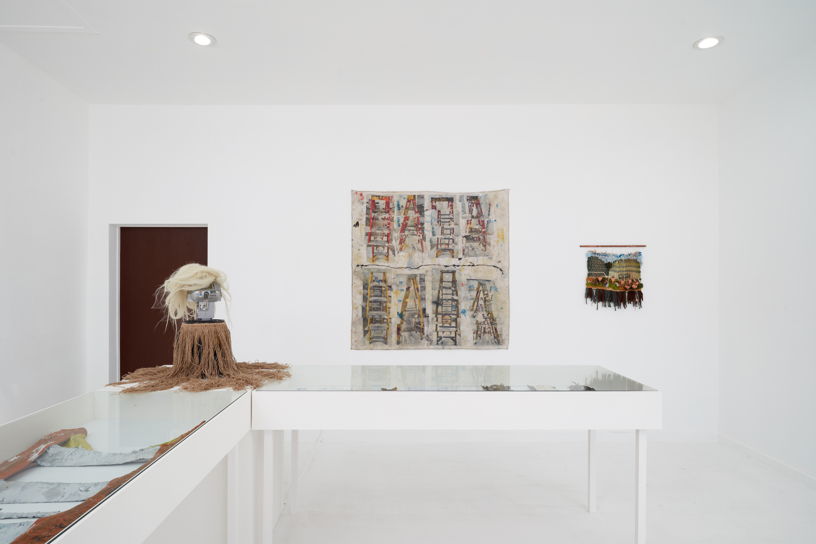 Naturally dyed textile, ceramic, found object, synthetic hair.