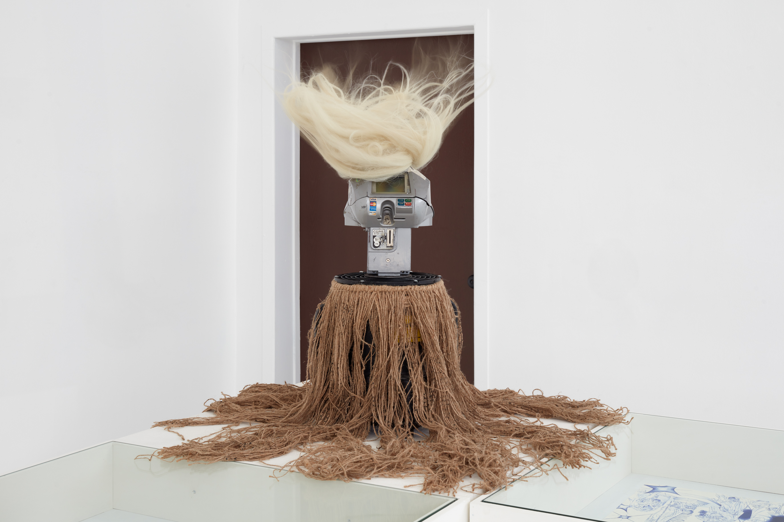 Parking meter, braiding hair, fan, burlap, glue.