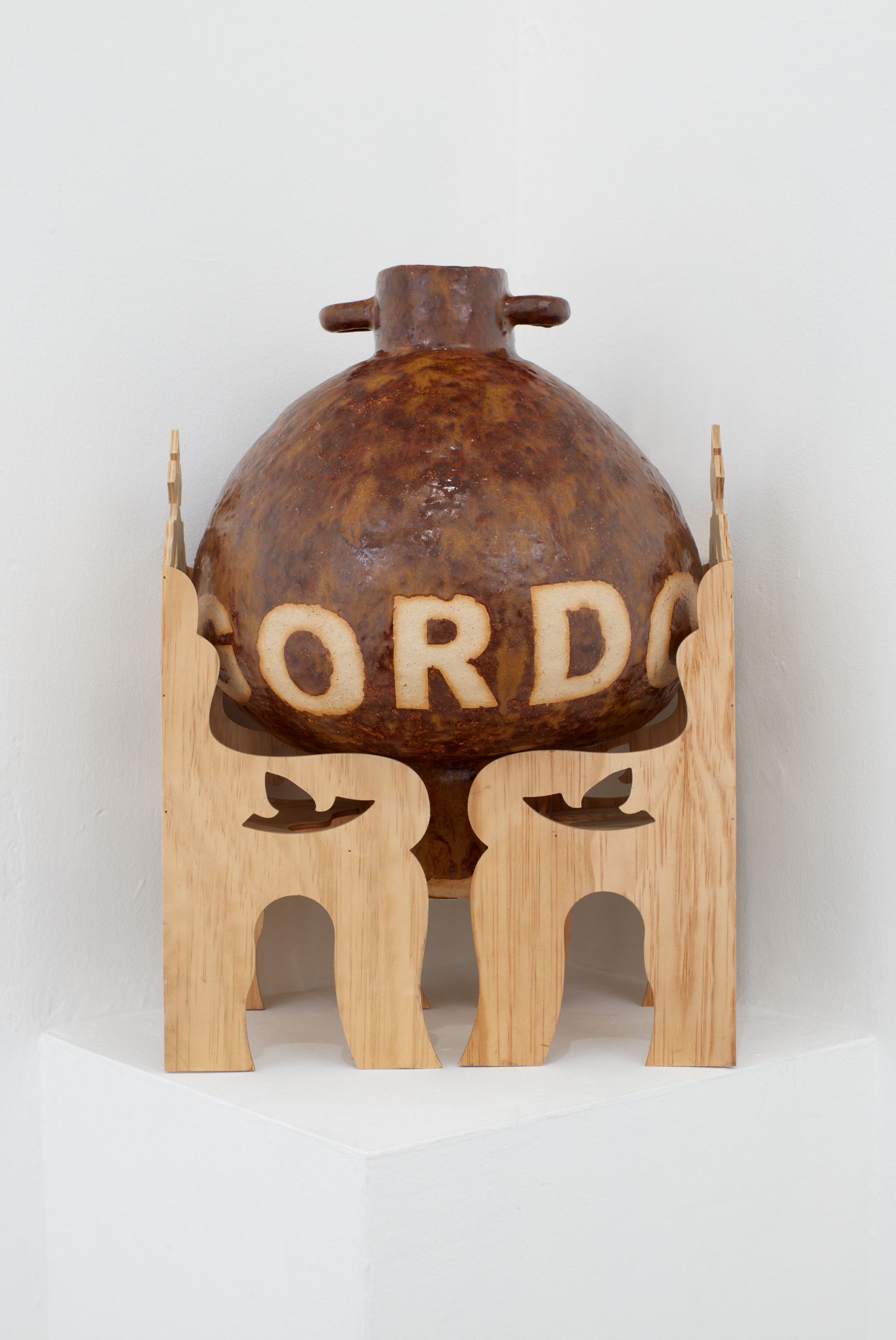 Glass, stoneware and plywood.